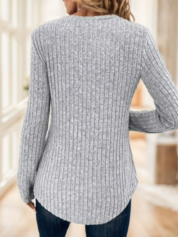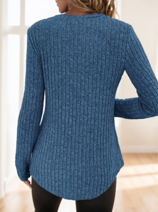 Ribbed Botton V Neck T-Shirt - Elegant Long Sleeve T-Shirt For Spring